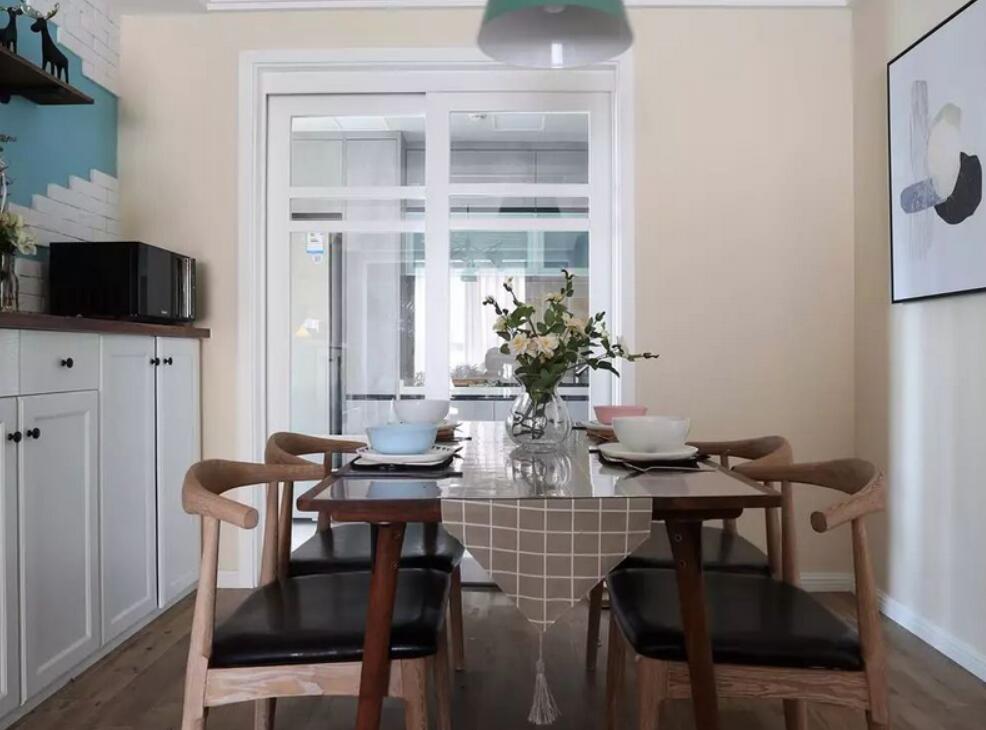 餐厅摆着一套极简原木质感的餐桌椅,总体显得餐椅简洁又端庄;