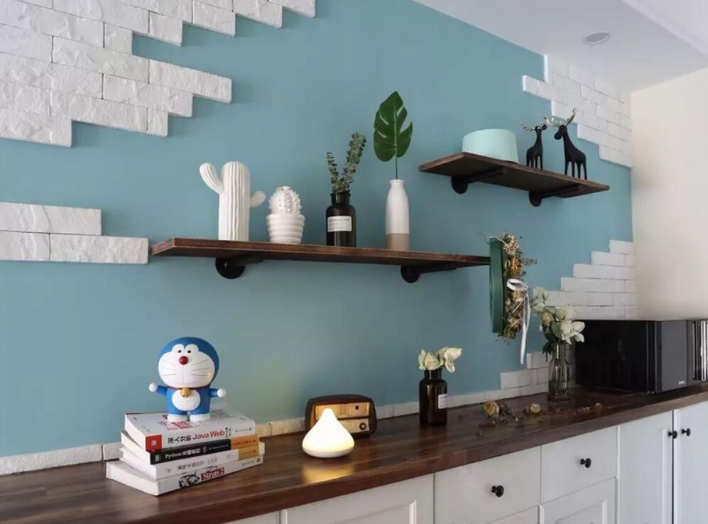 餐厅背景墙这里布置得相当的清新文艺,在墙脚装上一排实用的餐边柜,而上方的墙面则以文化砖+搁板架,布置上精致的小饰品,显得格外的情趣高档;